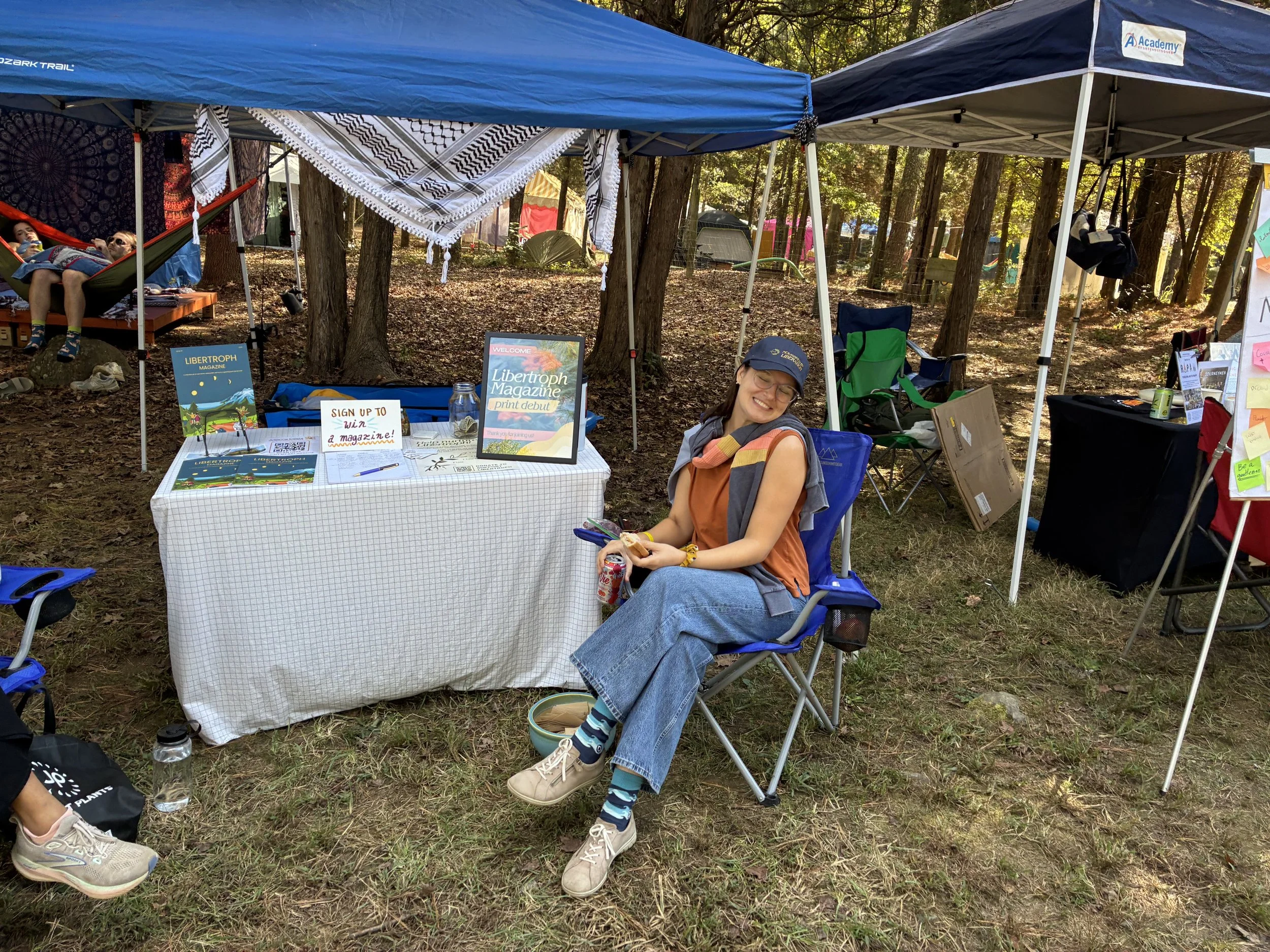 Image description: Julienne is seated in a lawn chair beside a table with a sign that announces Libertroph Magazine’s print debut, an invitation to sign up to win a magazine, and multiple magazines. A bowl of native wildflower seeds is by her feet and a keffiyeh hangs in the tent awning. Behind her are woods, tents, and folks in a hammock. She is smiling.